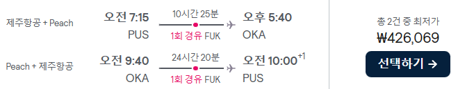 보다 가격을 다운시키고 싶다면 제주항공과 피치항공을 이용하는 방법도 있습니다. 똑같이 후쿠오카를 경유하며 왕복이 43만원으로 금액을 조금 낮추기는 했습니다. 다만 갈때는 10시간, 올때는 24시간이나 걸릴 정도로 시간이 엄청 소요됩니다.