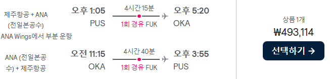 만약 경유를 이용하겠다면 후쿠오카를 경유하는 것이 시간적으로, 비용적으로 가장 낫습니다. 그 중 전일본공수에서 운항하는 편명은 경유지만 비행시간이 4시간 밖에 안 걸릴 정도로 경유지에서의 대기 시간이 짧습니다. 다만, 그만큼 비행기값이 비싸져 왕복에 무려 50만원 정도 합니다. 인천 출발이 30만원이었으니 20만원 가량 비싸지네요.